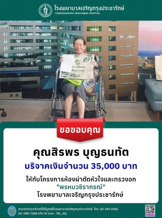 โรงพยาบาลเจริญกรุงประชารักษ์ ขอกราบขอบพระคุณ คุณสิรพร บุญธนทัต ในเมตตาจิตที่ร่วมบริจาคเงินจำนวน 35,000 บาท เพื่อสนับสนุนโครงการห้องผ่าตัดหัวใจและทรวงอก “พรหมวชิราภรณ์” เงินบริจาคของท่านคือส่วนสำคัญในการสร้างโอกาสและมอบชีวิตใหม่ให้กับผู้ป่วยโรคหัวใจและทรวงอก ให้ได้รับการรักษาที่ทันสมัยและทันท่วงที