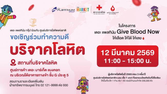บริษัท เดอะ แพลทินัม กรุ๊ป จำกัด (มหาชน) ร่วมกับศูนย์บริการโลหิตแห่งชาติ สภากาชาดไทย ขอเชิญทุกท่านร่วมทำความดี บริจาคโลหิต ในโครงการ “เดอะ แพลทินัม Give Blood Now ให้เลือด ให้ได้ ให้เลย” ให้กับศูนย์บริการโลหิตแห่งชาติ เพื่อนำไปช่วยเหลือผู้ป่วยโรคเลือดและผู้ที่ต้องการโลหิตในการรักษา โดยสามารถร่วมบริจาคโลหิตได้ในวันที่ 12 มีนาคม 2569 เวลา 11.00 – 15.00 น. ณ บริเวณใต้อาคารทางเข้าชั้น G ประตู 5 ศูนย์การค้าเดอะ มาร์เก็ต แบงคอก สำหรับผู้บริจาคโลหิตภายในปี 2569 ครบ 3 ครั้ง จะได้รับเสื้อ T-Shirt ที่ออกแบบโดยศิลปินที่มีชื่อเสียงให้เป็นที่ระลึกจากศูนย์บริการโลหิตแห่งชาติ ติดตามรายละเอียดที่น่าสนใจเพิ่มเติม ได้ใน Facebook : The Market Bangkok