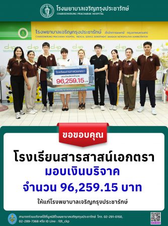 พญ.อรชุมา หุตะโกวิท รองผู้อำนวยการโรงพยาบาลเจริญกรุงประชารักษ์ (ฝ่ายการแพทย์) พร้อมด้วยคณะผู้บริหารโรงพยาบาลฯ ร่วมให้การต้อนรับและรับมอบเงินบริจาคจากผู้แทน โรงเรียนสารสาสน์เอกตรา จำนวน 96,259.15 บาท เพื่อสนับสนุนการดำเนินงานและยกระดับศักยภาพด้านการแพทย์ของโรงพยาบาลเจริญกรุงประชารักษ์