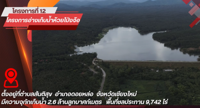 2.8 โครงการอ่างเก็บน้ำห้วยโป่งจ้อ หัวงานตั้งอยู่ที่ ตำบลสันติสุข อำเภอดอยหล่อ จังหวัดเชียงใหม่ พื้นที่ชลประทาน 9,742 ไร่ ประกอบด้วย 6 แผนงาน 46 กิจกรรมย่อย