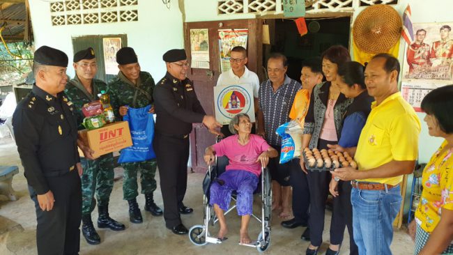 วันที่ 4 ต.ค.62 พ.อ.กรกานต์ นาเวชวนิชกุล รอง ผอ.กอ.รมน.จังหวัดประจวบ นายนคร ศรีสุทชานนท์ รองนายก อบต.อ่าวน้อย นายพิชิต สันติเมธากุล อดีตรองนายกเทศมนตรีเมืองประจวบ พร้อมด้วยทหารหน่วยเฉพาะกิจจงอางศึก เจ้าหน้าที่พัฒนาชุมชนอำเภอเมืองประจวบ เจ้าหน้าที่ กอ.รมน.จังหวัด นำความห่วงใยผู้ว่าราชการจังหวัดเข้าเยี่ยมเยียนให้กำลังใจครอบครัวของ นางมาลี นิลโต อายุ 70 ปี ณ บ้านเลขที่ 361 หมู่ 9 ตำบลอ่าวน้อย อำเภอเมือง จังหวัดประจวบ ซึ่งทางบ้านมีฐานะยากจน ป่วย พิการ ด้วยโรคกล้ามเนื้อขาอ่อนแรงไม่สามารถเดินได้ต้องนั่งรถวิลแชร์แทนการเดินเคลื่อนไหวไปทำกิจธุระส่วนตัว นอกจากนี้ในครอบครัวยังมีลูกชายที่ป่วยพิการอีก 1 คนด้วย ซึ่งครอบครัวดังกล่าวนี้ได้ตกเกณฑ์สำรวจ( จปฐ.)จากสำนักงานพัฒนาชุมชน ในปี 62 โดยทางกอ.รมน.จังหวัดได้มอบรถวีลแชร์คันใหม่จำนวน 1 คัน แทนคันเก่าที่ชำรุดพังเสียหาย และถุงยังชีพ ข้าวสาร อาหารแห้ง น้ำปลา ปลากระป๋อง น้ำมันพืช ฯลฯ ซึ่งได้รับการสนับสนุนมาจาก ดร.หิมาลัย ผิวพรรณ ประธานที่ปรึกษามูลนิธิพระราหู โครงการใจถึงใจ คนไทยไม่ทิ้งกัน เพื่อเป็นการบรรเทาความเดือดร้อนในการดำรงชีพในเบื้องต้น พร้อมกับให้สำนักงานพัฒนาชุมชนเก็บรวบรวมข้อมูลประวัติครัวเรือนนำเข้าสู่ระบบเกณฑ์ จปฐ.นอกจากนี้ยังได้มอบน้ำดื่มสะอาดซึ่งได้รับการสนับสนุนมาจากกลุ่มบริษัทอีซูซุอึ้งง่วนไต๋ และไข่ไก่จากฟาร์มของนายพิชิต สันติเมธากุล อดีตรองนายกเทศมนตรีเมืองประจวบคีรีขันธ์อีกด้วย