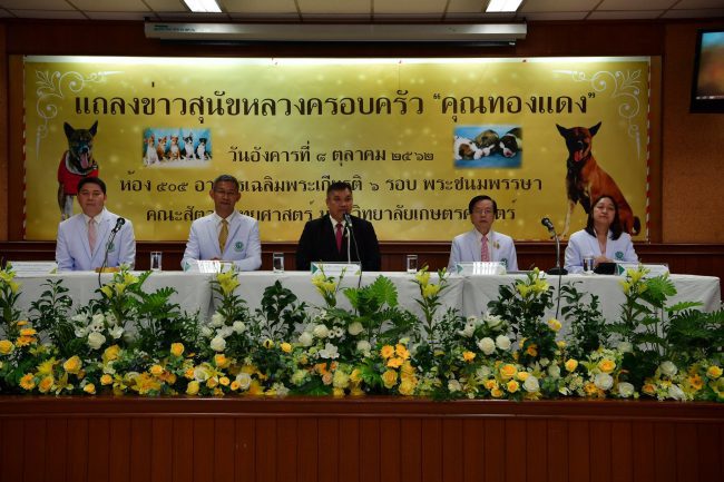 คณะสัตวแพทยศาสตร์ มก. แถลงข่าว “ครอบครัวคุณทองแดง” จากการผสมเทียมน้ำเชื้อแช่แข็งลูกคุณทองแดง โดยมี ดร.จงรัก วัชรินทร์รัตน์ รักษาการแทนอธิการบดี เป็นประธาน และ ผศ.น.สพ.ดร.คงศักดิ์ เที่ยงธรรม คณบดีคณะสัตวแพทยศาสตร์ ผศ.น.สพ.ดร.ธวัชชัย ศักดิ์ภู่อร่าม ผู้ทรงคุณวุฒิพิเศษ ผศ.สพ.ญ.ดร.จันทร์จิรา ภวภูตานนท์ รองหัวหน้าภาควิชาเวชศาสตร์คลินิกสัตว์เลี้ยง น.สพ.นนทษิต ชุติญาณวัฒน์ ผู้ช่วยคณบดีฝ่ายกิจการพิเศษ ร่วมแถลงข่าว เมื่อวันที่ 8 ตุลาคม เวลา 14.00 น. ณ คณะสัตวแพทยศาสตร์ มก. บางเขน