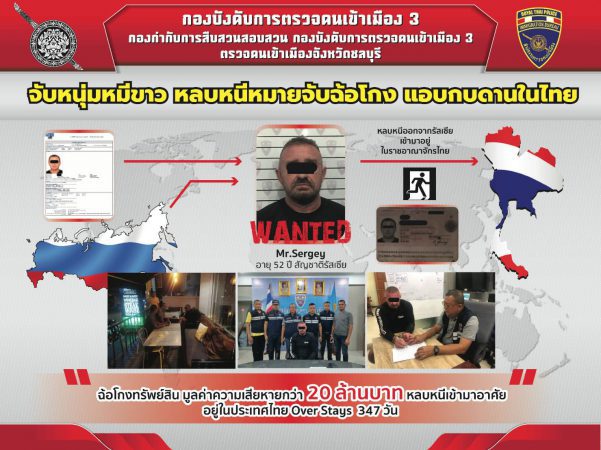 ด้วยเมื่อวันที่ 25 กันยายน 2562 เจ้าหน้าที่กองกำกับการสืบสวน สอบสวนกองบังคับการตรวจคนเข้าเมือง 3 ร่วมกับเจ้าหน้าที่ตรวจคนเข้าเมืองจังหวัดชลบุรี ได้รับแจ้งจากพลเมืองดีว่ามีชาวรัสเซียหลบหนีหมายจับจากประเทศรัสเซียเข้ามาอยู่ในประเทศไทย จึงได้ทำการสืบสวนประสานงานกับเจ้าหน้าที่สถานทูตรัสเซียทราบว่านายเซอร์เก้ (MR.SERGEY) อายุ 52 ปี ถือหนังสือเดินทางประเทศรัสเซีย เดินทางเข้ามาในราชอาณาจักรครั้งแรก เมื่อวันที่ 14 ธันวาคม 2554 มีการเดินทางเข้า-ออกราชอาณาจักรบ่อยครั้ง ครั้งสุดท้ายเมื่อวันที่ 14 กันยายน 2561 ที่จุดตรวจถาวรบ้านผักกาด ตม.จว.จันทบุรีได้รับการตรวจลงตราประเภท ผ.ผ.30 อนุญาตถึงวันที่ 13 ตุลาคม 2561การอนุญาตสิ้นสุดจำนวน 347 วัน โดยนายเซอร์เก้ (SERGEY) ได้เคยประกอบธุรกิจประเภท ก่อสร้างอาคารให้กับรัฐบาลจนเมื่อช่วงปี พ.ศ. 2557-2558 และ ได้ก่อเหตุหลอกลวงผู้เสียหายในสัญญาก่อสร้างอาคาร สำนักงานอัยการในประเทศสหพันธรัฐรัสเซีย ในเมืองเซอร์กัท มูลค่าความเสียหายกว่า 20 ล้านบาท จากนั้นได้หลบหนีมาหลบซ่อนตัวในประเทศไทย จนกระทั่งถูกหมายจับจากตำรวจสากล เมื่อวันที่ 12 พฤศจิกายน 2561 โดยพักอาศัยในจังหวัดชลบุรี ประเทศไทย จนถูกเจ้าหน้าที่ กก.สส.บก.ตม.3 จับกุมตัวได้ ที่ บริเวณหน้าร้าน Livv finest food & drinks ต.หนองปรือ อ.บางละมุง จว.ชลบุรี เป็นคนต่างด้าวอยู่ในราชอาณาจักรโดยการอนุญาตสิ้นสุด จำนวน 347 วัน ส่ง พนักงานสอบสวน สภ.เมืองพัทยา ดำเนินคดี ต่อไป