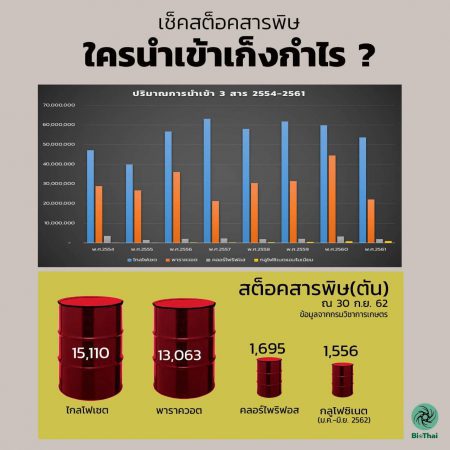 เมื่อพิจารณาถึงการเก็งกำไรของบริษัทสารเคมีกำจัดทางการเกษตรนั้น จากสถิติที่เห็นได้ชัดเจนว่า เป็นการนำเข้าพาราควอตเพื่อกักตุนในปี 2560 หลังกระทรวงสาธารณสุขเสนอให้มีการแบนสารดังกล่าว โดยการนำเข้ากระโดดสูงเพิ่มขึ้นจาก 31,525,596 กิโลกรัม เป็น 44,501,340 กิโลกรัม หรือเพิ่มขึ้นกว่า 41% และคลอร์ไพริฟอส เพิ่มขึ้นจาก 2,071,128 เป็น 3,324,806 กิโลกรัม หรือเพิ่มขึ้นมากถึง 61% จึงเห็นว่า การปั้นข่าวนักการเมืองเก็งกำไร สารกลูโฟซิเนตเป็นการพยายามปั่นกระแสเพื่อสร้างความชอบธรรมจากกลุ่มการเมืองอีกกลุ่มในการต่อต้านการแบนพาราควอตและไกลโฟเซต ทั้งนี้มูลนิธิไบโอไทยไม่เห็นด้วยต่อแนวทางการแบนสารพิษ 2 ชนิดและนำเข้าสารพิษอีกตัวเพิ่มขึ้น แต่ควรเสนอทางเลือกในการควบคุมจำกัดวัชพืชโดยใช้ เครื่องกลเครื่องจักรกล พืชคลุมดิน และการจัดระบบการปลูกพืชแทน