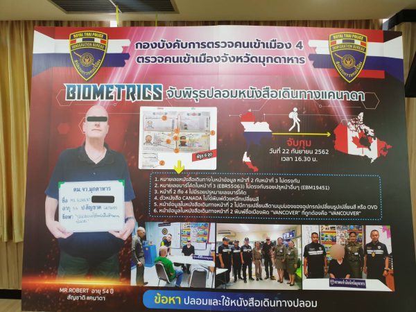 เมื่อวันที่ 22 กันยายน 2562 เวลาประมาณ 16.30 น. ตม.จว.มุกดาหาร ได้จับกุมตัว นายโรเบิร์ต (MR.ROBERT) อายุ 54 ปี สัญชาติแคนาดา พร้อมของกลาง หนังสือเดินทางประเทศแคนาดา จำนวน 1 เล่ม โดยกล่าวหาว่า “ปลอมและใช้หนังสือเดินทางปลอม” พฤติการณ์คือ ตามวันเวลาเกิดเหตุขณะที่นายโรเบิร์ตได้แสดงหนังสือเดินทางต่อพนักงานเจ้าหน้าที่ตรวจคนเข้าเมือง เพื่อเดินทางออกนอกราชอาณาจักร เพื่อตรวจอนุญาต ปรากฏการแจ้งเตือนในระบบตรวจสอบหนังสือเดินทาง (BIOMETRICS) ว่าเอกสารหนังสือเดินทางดังกล่าว ได้ถูกแจ้งหายและถูกโจรกรรม ตามข้อมูลขององค์กรตำรวจสากล (INTERPOL) จึงได้ประสานกับเจ้าหน้าที่ประจำสถานทูตแคนาดาประจำประเทศไทย ได้รับแจ้งยืนยันว่าหนังสือเดินทางดังกล่าวมีการปลอมหน้าประวัติผู้ถือ โดยกองหนังสือเดินทางของแคนาดา ได้ออกหนังสือเดินทางเล่มดังกล่าว ให้กับ นางโจเซ่ (MRS.JOSEE) ตามฐานข้อมูลหนังสือเดินทาง เอกสารเล่มดังกล่าวได้ถูกบันทึกแจ้งหายไว้ทำให้ไม่สามารถใช้เดินทางได้อีกต่อไป จากนั้นได้นำตัวคนต่างด้าวพร้อมหนังสือเดินทางของกลาง มาตรวจสอบเปรียบเทียบกับข้อมูลรายละเอียดของหนังสือเดินทางฉบับจริงพบข้อแตกต่าง ดังนี้