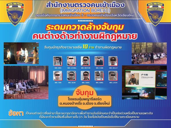 ตรวจคนเข้าเมืองจังหวัดเชียงใหม่ กองบังคับการตรวจคนเข้าเมือง 5 ได้บูรณาการร่วมกับเจ้าหน้าที่แรงงานจังหวัดเชียงใหม่ พร้อมด้วยเจ้าหน้าที่ตรวจคนเข้าเมือง และเจ้าหน้าที่ตำรวจ สถานีตำรวจภูธรแม่ปิง จังหวัดเชียงใหม่ ตรวจสอบกลุ่มบุคคลต่างด้าวชาวมาเลเซีย 10 ราย ได้แก่ 1.MR.ENG 2.MR.LEONG 3.MR.IRETON 4.MR.CHIN 5.MR.KELLY 6.MR.TAN 7.MR.SIEW 8.MR.TANG 9.MR.HING 10.MR.LOOH