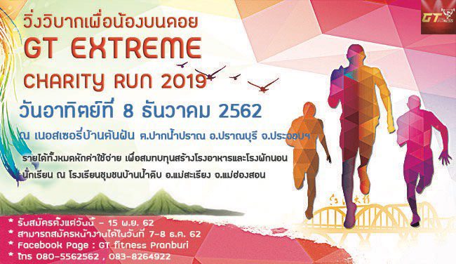 โดยการจัดกิจกรรมในครั้งนี้ จัดขึ้นที่ เนอสเซอรี่บ้านต้นฝัน ต. ปากน้ำปราณ อ. ปราณบุรี จ. ประจวบคีรีขันธ์ ในวันที่ 8 ธันวาคม 2562 เพื่อนำรายได้ทั้งหมด หลังหักค่าใช้จ่ายสมทบทุนสร้างโรงอาหารและเรือนพักนอนนักเรียน ณ โรงเรียนชุมชนบ้านน้ำดิบ อ.แม่สะเรียง จ.แม่ฮ่องสอน ที่ขาดแคลนโรงอาหารและเรือนนอนที่แข็งแรง ท่านใดสนใจสมัครได้ตั้งแต่วันนี้ – 5 ธ.ค. 2562 สมัครด้วยตนเองผ่านเว็บไซต์ https://register.bothlnw.com/login?redirect=gt2019/frm_reg หรือสมัครด้วยตนเองที่ จีที ฟิตเนสและสระว่ายน้ำ ปราณบุรี ที่ตั้ง รัฐบำรุง 7 (ซอยตำหรุ) อ.ปราณบุรี จ.ประจวบฯ