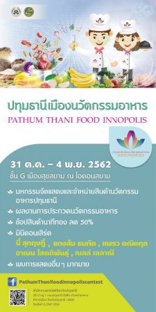 จังหวัดปทุมธานี โดย สำนักงานพาณิชย์จังหวัดปทุมธานี เตรียมโชว์นวัตกรรมอาหารต้นแบบ พร้อมยกระดับมาตรฐานผลิตภัณฑ์อาหารของปทุมธานี สร้างคุณค่าและมูลค่าเพิ่มด้วยนวัตกรรมและเทคโนโลยี ผ่านการประกวดและคัดสรรผลิตภัณฑ์อาหารสร้างสรรค์นับ100 รายการ พร้อมโชว์ศักยภาพของผู้ประกอบการปทุมธานีในงาน “ปทุมธานี เมืองนวัตกรรมอาหาร” Pathum Thani Food Innopolis” ระหว่างวันที่ 31 ตุลาคม – 4 พฤศจิกายน 2562 ณ สุขสยาม ชั้น G ศูนย์การค้าไอคอนสยาม กรุงเทพฯ