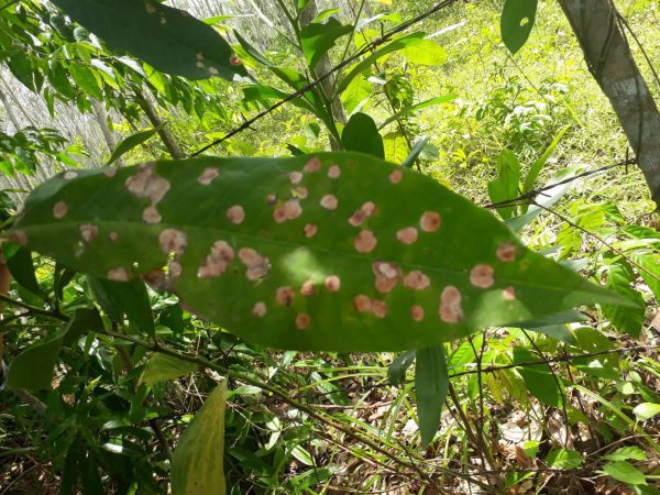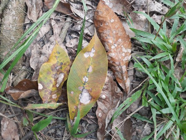 รวมทั้งแปลงที่อยู่ใกล้เคียงกับแปลงที่เกิดโรคสามารถฉีดพ่นป้องกันได้ โดยเชื้อราชนิดนี้ทำลายต้นยางพันธุ์ที่ปลูกในพื้นที่นั้น ได้แก่ พันธุ์ RRIM 600 พันธุ์ RRIT 251 และ พันธุ์ PB 311 ลักษณะอาการที่ปรากฏบนใบยางแก่ เมื่อเริ่มแสดงอาการจะมีรอยช้ำเป็นกลุ่มเห็นชัดเจนด้านหลังใบ หลังจากนั้นจะกลายเป็นวงค่อนข้างกลมสีเหลือง (Chlorosis) ต่อมาเนื้อเยื่อรอยสีเหลืองจะตายแห้ง (Necrosis) เป็นแผลกลมสีสนิมซีด โดยพบอาการจุดแผลต่อใบยางมากกว่า 1 แผล ต่อมาใบจะเหลืองและร่วงในที่สุด รวมถึงทำลายใบยางทุกระยะ ดังนั้นสวนใกล้เคียงกับสวนที่เกิดโรคจำเป็นต้องฉีดพ่นสารป้องกัน สำหรับสวนที่เกิดโรคแล้ว เมื่อผลิใบอ่อนออกมาใหม่ต้องฉีดพ่นป้องกันซ้ำด้วย