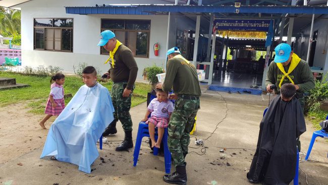 ฉก.จงอางศึก ระดมทหารช่างตัด ผมออกหน่วยบริการตัดผมนักเรียนศูนย์พัฒนาเด็กเล็กด่านสิงขร ลดค่าใช้จ่ายผู้ปกครองก่อนเปิดภาคเรียน