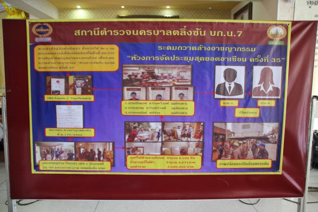 โดย เจ้าหน้าที่ฝ่ายสืบสวน สน.ตลิ่งชันได้ทำการสืบสวนหาข่าวทางโลกออนไลน์เกี่ยวกับการจำหน่ายสิ่งของผิดกฎหมาย พบว่ากลุ่มผู้ต้องหาได้มีการจำหน่ายบุหรี่ไฟฟ้า เมื่อตรวจสอบการส่งไปรษณียภัณฑ์ พบว่ามีการส่งไปรษณียภัณฑ์จำนวนมากจากบุคคลต้องสงสัยภายในบ้าน จากการสืบสวนหาข่าว พบว่ากลุ่มผู้ต้องหาได้เช่าบ้านหลังดังกล่าวในราคาเดือนละ 70,000 บาท เพื่อเก็บสินค้าและจัดจำหน่ายส่งสินค้า ฝ่ายสืบสวนจึงได้ทำการขอหมายค้น แล้วบูรณาการกำลังทุกฝ่าย เข้าทำการตรวจค้น ผลการตรวจค้นพบบุหรี่ไฟฟ้าและอุปกรณ์ รวมทั้งน้ำยาบุหรี่ไฟฟ้า ของกลาง จำนวนมาก (ตามรายการของกลาง) รวมมูลค่าประมาณ 7 ล้านบาท จึงได้ทำการจับกุมตัวผู้ต้องหา แล้วควบคุมตัวผู้ต้องหาพร้อมของกลางทั้งหมดนำส่ง พงส.สน.ตลิ่งชัน ดำเนินคดีตามกฎหมาย โดยสามารถจับกุมตัวผู้ต้องหาได้ที่ บ้านเลขที่ 25/89 ม.ปิ่นเกล้า ถนนราชพฤกษ์ แขวงบางระมาด เขตตลิ่งชัน กรุงเทพฯ พ.ต.อ.สุวโรจน์ โชติกาญจนรัศมิ์ ผกก.สน.ตลิ่งชัน สอบสวนผู้ต้องหาให้การรับสารภาพตลอดข้อกล่าวหา