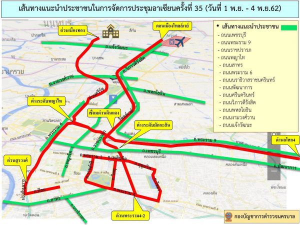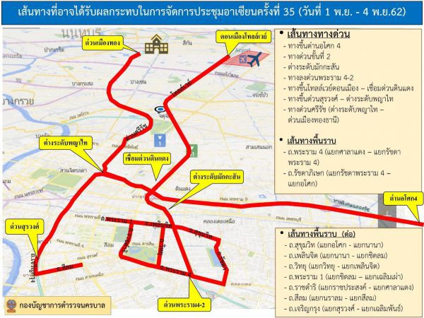 พล.ต.ท.ดำรงศักดิ์ กิตติประภัสร์ ผู้ช่วย ผบ.ตร., พล.ต.ต.จิรสันต์ แก้วแสงเอก รอง ผบช.น. และ พล.ต.ต.คมศักดิ์ สุมังเกษตร ผบก.จร. ขอประชาสัมพันธ์ข่าวสารการจราจรให้ประชาชนได้รับทราบ กรณี รัฐบาลไทยได้รับเกียรติเป็นเจ้าภาพจัดการประชุมสุดยอดผู้นำอาเซียน ครั้งที่ 35 ระหว่างวันที่ 31 ต.ค. – 4 พ.ย.62 ในการประชุมดังกล่าวมีความจำเป็นต้องปิดการจราจรในบางเส้นทาง และบางช่วงเวลา ซึ่งอาจส่งผลกระทบต่อการเดินทางของพี่น้องประชาชนในเส้นทางที่เกี่ยวข้อง ดังนี้