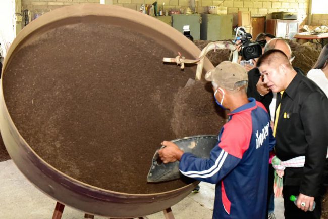 จากนั้น รัฐมนตรีช่วยว่าการกระทรวงเกษตรและสหกรณ์ เดินทางต่อไปยังธนาคารปุ๋ยอินทรีย์หมอดิน เลขที่ 145 หมู่ 5 ต.ดอนขุนห้วย อ.ชะอำ จ.เพชรบุรี เพื่อตรวจเยี่ยมชมการทำปุ๋ยและทำปุ๋ยหมักอินทรีย์แบบผง/ปั้นเม็ด ของ นายศักดา ลักษณะภู (หมอดินแอ้ว) หมอดินอาสาประจำอำเภอชะอำ ซึ่งเป็นผู้มีความรู้ความสามารถด้านการผลิตปุ๋ยหมักแบบเติมอากาศ และการคิดค้นผลิตปุ๋ยอินทรีย์คุณภาพสูง ในการปรับปรุงสภาพพื้นดินของตนเอง สามารถปลูกพืชได้ทุกชนิด ดินมีความอุดมสมบูรณ์เป็นอย่างมาก เป็นที่ยอมรับของเกษตรกรในพื้นที่จังหวัดเพชรบุรี และพื้นที่จังหวัดใกล้เคียง แต่เดิมพื้นที่โรงปุ๋ยอินทรีย์แห่งนี้ อยู่ในพื้นที่โครงการตามพระราชประสงค์ดอนขุนห้วย พื้นที่ส่วนใหญ่เป็นดินทราย ดินขาดความอุดมสมบูรณ์ เนื่องจากการใช้ประโยชน์จากที่ดินเป็นระยะเวลานาน ทำให้ดินขาดอินทรียวัตถุ เกษตรกรส่วนใหญ่ปลูกสับปะรดเพราะเป็นพืชใช้น้ำน้อย จากความเสื่อมโทรมดังกล่าว ซึ่งทางสถานีพัฒนาที่ดินเพชรบุรีได้เข้ามาวางแผนการใช้ประโยชน์จากที่ดิน แก้ไขฟื้นฟูสภาพดินและการปรับปรุงดินโดยการปลูกพืชปุ๋ยสด การแก้ปัญหาความเป็นกรดด่างของดินโดยใช้ปูนโดโลไมท์ ส่งเสริมการปลูกหญ้าแฝกเพื่อการอนุรักษ์ดินและน้ำ รวมถึงแนะนำการผลิตปุ๋ยหมัก ด้วยสารเร่งซุปเปอร์ พด.1 และการทำน้ำหมักชีวภาพ ด้วยสารเร่งซุปเปอร์ พด.2 ไว้ใช้เอง เป็นการลดต้นทุน และเร่งการเจริญเติบโตของพืชได้อย่างดี