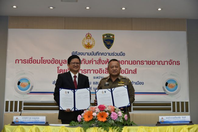 วันนี้ (14 พฤศจิกายน 2562) เวลา 09.30 น. นายสราวุธ เบญจกุล เลขาธิการสำนักงาน ศาลยุติธรรม และพลตำรวจตรี พรชัย ขันตี รองผู้บัญชาการสำนักงานตรวจคนเข้าเมือง รักษาราชการแทน ผู้บัญชาการสำนักงานตรวจคนเข้าเมือง ร่วมลงนามบันทึกความร่วมมือการเชื่อมโยงข้อมูลเกี่ยวกับคำสั่งห้ามออกนอกราชอาณาจักรโดยวิธีการทางอิเล็กทรอนิกส์ เพื่อเพิ่มประสิทธิภาพการปฏิบัติงานของทั้งสองหน่วยงานให้รวดเร็วและถูกต้องยิ่งขึ้น