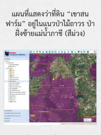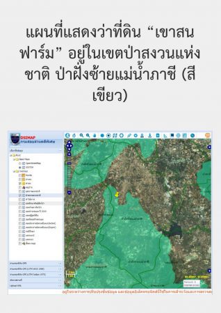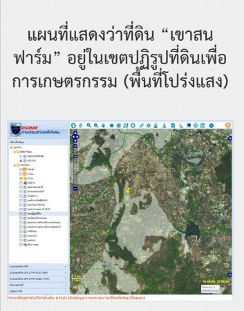ด้านนายโสภณ พรโชคชัย ประธานกรรมการบริหาร ศูนย์ข้อมูลวิจัยและประเมินค่าอสังหาริมทรัพย์ไทย บริษัท เอเจนซี่ ฟอร์ เรียลเอสเตท แอฟแฟร์ส จำกัด กล่าวว่า ศูนย์ข้อมูลนี้เก็บข้อมูลอสังหาริมทรัพย์ภาคสนามต่อเนื่องมาตั้งแต่ พ.ศ.2537 มีฐานข้อมูลขนาดใหญ่ที่สุดและปรับปรุงให้ทันสมัยที่สุดในประเทศไทย อีกทั้งได้ประมวลผลควบคู่กับแผนที่เบื้องต้นเกี่ยวกับแนวป่า ชื่อ http://map.dsi.go.th ของกรมสอบสวนคดีพิเศษ (ดีเอสไอ) พบว่า “เขาสนฟาร์ม” อยู่ในเขตป่าสงวนแห่งชาติ ป่าฝั่งซ้ายแม่น้ำภาชี ส่วนหนึ่งอยู่ในแนวป่าไม้ถาวร ป่าฝั่งซ้ายแม่น้ำภาชี และอีกส่วนอยู่ในเขตปฏิรูปที่ดินเพื่อการเกษตรกรรม