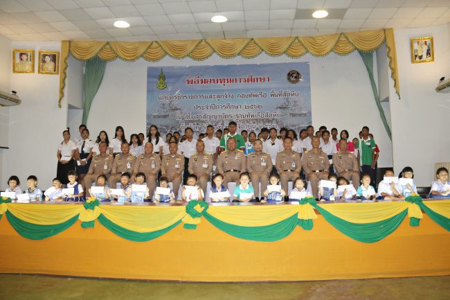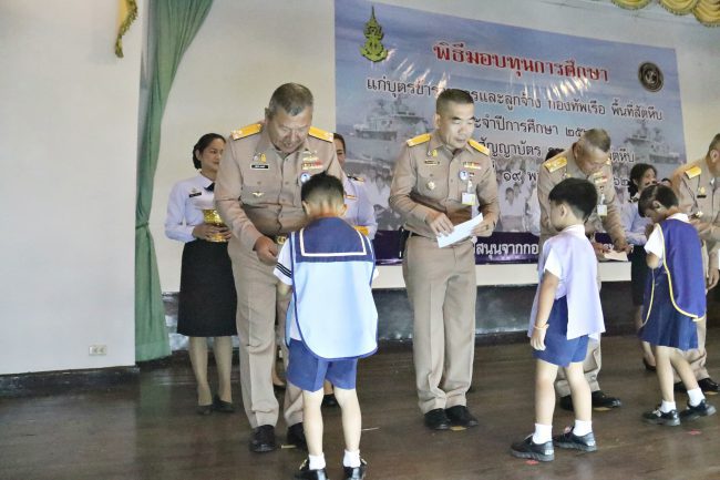 กองทัพเรือได้มอบให้ฐานทัพเรือสัตหีบรับผิดชอบในการดำเนินการ จัดพิธีมอบทุนการศึกษาให้แก่บุตรข้าราชการ ลูกจ้าง ที่ผ่านการพิจารณาคัดเลือก จากคณะกรรมการกองทัพเรือ ที่ได้รับทุนการศึกษา จำนวนทั้งสิ้น 563 ทุน จำแนกเรีนทุน ระดับต่าง ๆ 5ระดับ ได้แก่ ระดับอุดมศึกษา จำนวน 31ทุนๆละ 5,500บาท ระดับมัธยมศึกษา จำนวน177 ทุนๆละ 3,500 บาท ระดับประถมศึกษา จำนวน253 ทุน ๆละ 3,000 บาท ระดับอนุบาลศึกษา จำนวน94 ทุนๆละ 3,000 บาท ทุนสำหรับบุตรข้าราชการ ที่เป็นผู้พิการและกำลังศึกษาอยู่ในระดับอนุบาลศึกษาถึงอุดมศึกษาหรือเทียบเท่า จำนวน 8ทุน ๆ ละ 5,000 บาท
