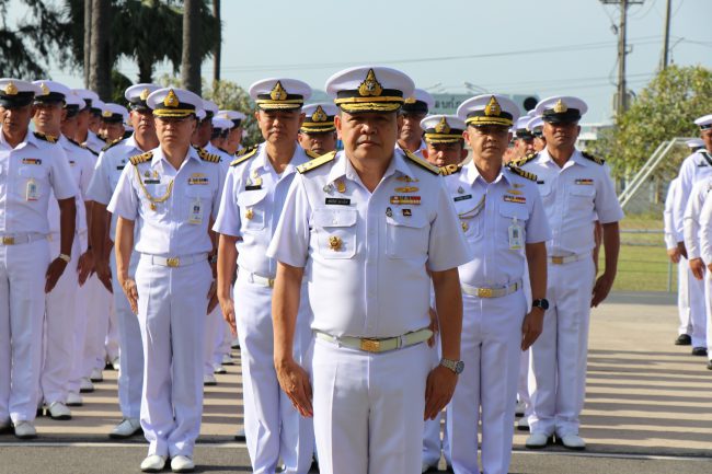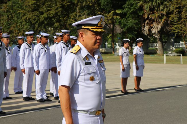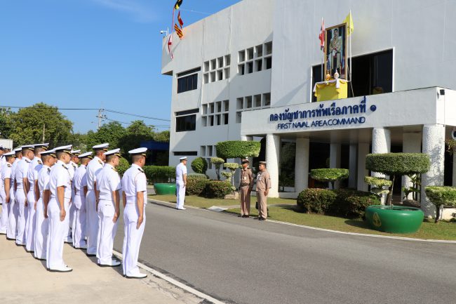 ผู้บัญชาการทัพเรือภาคที่ 1 กำลังพลแถวฟังสารจากผู้บัญชาการทหารเรือ และเข้าร่วมกิจกรรมเนื่องในวันกองทัพเรือ ประจำปี 2562