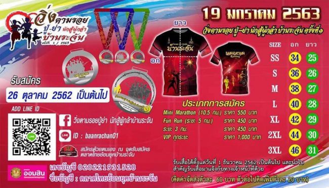 - สมัครด้วยตนเองที่ ตลาดไทยย้อนยุคบ้านระจัน อำเภอค่ายบางระจัน จังหวัดสิงห์บุรี (เฉพาะวันเสาร์-อาทิตย์) ID LINE : baanrachan01 , FB FANPAGE : วิ่งตามรอยปู่ย่า นักสู้ผู้กล้าบ้านระจัน