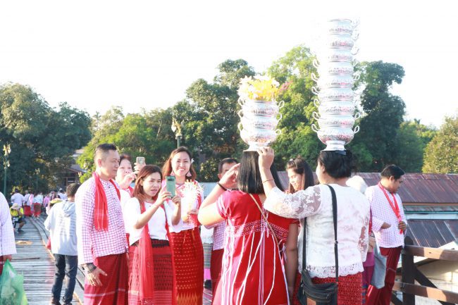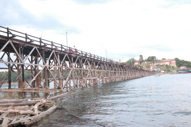 สัมผัสบรรยากาศสะพานมอญ เช้าตรู่ของวันรุ่งขึ้นวันแรก คณะของเราก็ออกเดินทางจากที่พัก เพื่อไปสัมผัสบรรยากาศที่สะพานมอญ บ้างก็จับกล้องส่องพระอาทิตย์ขณะโผล่ขึ้นจากยอดเขา บ้างก็ไปช็อบ-ชิม-แชะกันบริเวณตลาดชาวมอญ บริเวณที่พระจะออกมาบิณฑบาต ต่างแต่งกายชุดประจำชาติมอญ ที่ทางพ่อค้าจำหน่ายอาหารหามาให้สวมใส่กันทั้งหญิงและชาย ไม่เว้นแม้แต่ฝรั่งมังค่า ชั่งเป็นบรรยากาศที่กลมกลืนกันไปหมดในบริเวณนั้น ถึงเวลาพระสงฆ์ก็เดินผ่านมาเพื่อรับบิณฑบาต เสร็จภารกิจการทำบุญตักบาตรกันแล้ว คณะของเราก็เดินขึ้นสะพานไม้ที่ยาวที่สุดในประเทศไทย ซึ่งเป็นอันดับที่สองของโลก รองจากพม่า ใช้ชุดที่สวมใส่ไปบันทึกภาพเพื่อเก็บไว้เป็นความทรงจำ บนสะพานพบกับชาวมอญที่เทินหม้อบนศีรษะเกือบสูงเท่าตัว เดินโชว์ให้ช่างภาพได้เก็บภาพกันสนุกมือ พร้อมทั้งยังให้บริการหัดเทินหม้อกันด้วย ค่าใช้จ่ายก็แล้วแต่จะศรัทธา พร้อมทั้งมีทั้งมัคคุเทศก์น้อยใหญ่เดินกันควักไขว่ เพื่อรอให้ความรู้ที่เกี่ยวกับความเป็นมาในพื้นที่ เราใช้เวลากันที่นั้นนานพอควร ก่อนที่จะกลับที่พักเพื่อรับประทานข้าวเช้ากัน เสร็จสัพก็ออกเดินทางไปชมวัดวังก์วิเวการาม ที่ถูกสร้างในรูปลักษณะในแบบฉบับของมอญโดยแท้ ในศาลาเป็นที่ตั้งของหลวงพ่ออุตตมะจำลอง ประดับประดาในรูปลักษณ์แบบมอญโดยแท้ นอกจากนั้นก็สร้างซุ้มเจดีย์เป็นที่ครอบที่เก็บกระดูกของหลวงพ่ออุตตมะไว้ภายใน จากนั้นเราได้เดินทางไปสักการะเจดีย์พุทธคยาจำลององค์ใหญ่มหึมา เหลืองอร่ามเป็นที่ศรัทธาของผู้พบเห็น ภายในมีพระพุทธรูปประดิษฐานอยู่ให้สาธุชนขึ้นไปกราบไหว้ ด้านหน้าเจดีย์เป็นที่ตั้งของร้านค้าตั้งอยู่เรียงราย ที่จำหน่ายของที่ระลึกทั้งของมอญและพม่ามุ่งหน้าสู่ชุมชนกะเหรี่ยง