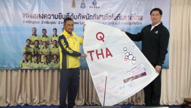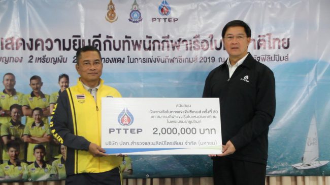ขณะที่ นายพงศธร ทวีสิน ผอ.ปตท.สผ.กล่าวว่าทาง ปตท.สผ.สนับสนุสมาคมกีฬาแข่งเรือใบแห่งประเทศไทยฯ มากว่า 14 ปี ภูมิใจและยินดีอย่างยิ่งที่นักเรือใบทุกคนทำผลงานได้ดีเยี่ยมในกีฬาซีเกมส์ และเพื่อเป็นการขอบคุณนักกีฬาที่สร้างชื่อเสียงให้ประเทศไทย พร้อมกันนี้ทาง ปตท.สผ.ได้มอบเงินรางวัลพิเศษจำนวน 2 ล้านบาทให้นักกีฬาและทีมผู้ฝึกสอนเพื่อเป็นกำลังใจในการแข่งขันในครั้งต่อๆไป และสำหรับการแข่งขันกีฬาโอลิมปิกเกมส์ 2020 ซึ่งปตท.สผ. เชื่อว่านักกีฬาจะทำผลงานได้ตามเป้าหมาย และสร้างชื่อเสียง และความภาคภูมิใจให้กับประ เทศไทยได้เหมือนเช่นเคย
