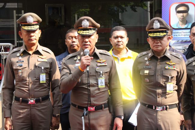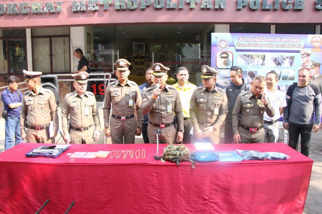 พล.ต.ท.ภัคพงศ์ พงษ์เภตรา ผบช.น. แถลงข่าวจับกุมผู้ต้องหาในคดีชิงทรัพย์และมีอาวุธปืน (ร้านทอง) สน.โชคชัย บก.น.4