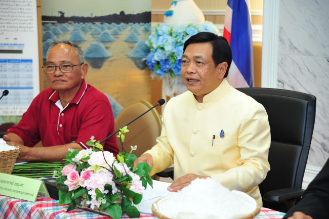 นายอลงกรณ์ พลบุตร ที่ปรึกษารัฐมนตรีว่าการกระทรวงเกษตรและสหกรณ์ กล่าวภายหลังเป็นประธานประชุม คณะกรรมการพัฒนาเกลือทะเลไทย ครั้งที่ 4 ร่วมกับหน่วยงานที่เกี่ยวข้อง ว่ากสรประชุมดังเพื่อแก้ปัญหาราคาเกลือตกต่ำเนื่องจากปัญหาด้านประมงทำให้ความต้องการใช้เกลือทะเลลดลง การนำเข้าเกลือทะเลมีราคาต่ำกว่าราคาจำหน่าย รวมถึงประกาศกระทรวงสาธารณสุขเกี่ยวกับการกำหนดปริมาณไอโอดีนในเกลือบริโภคให้ทำผลผลิตเกลือทะเลตกค้าง โดยฤดูกาลผลิต 2561/62 ตกค้างในยุ้งเกษตรกร 15,783 เกวียนและจะมีผลผลิตปี 2562/63 อีก 620,000 เกวียน เกินความต้องการตลาดส่งผลให้ราคาตกต่ำขณะนี้ราคาเกลือที่เกษตรกรขายได้อยู่ที่กิโลกรัมละ 80 สตางค์ ต่ำกว่าทุนที่กิโลกรัมละ 1 บาท 50 สตางค์