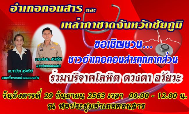 ผู้สื่อข่าวรายงานว่าเมื่อวันอังคารที่ 29 กันยายน 2563 คณะเหล่ากาชาดจังหวัดชัยภูมิร่วมกับโรงพยาบาลชัยภูมิ โรงพยาบาลคอนสารและ กิ่งกาชาดอำเภอคอนสาร นำโดย นายเสกสรร สวัสดิ์ศรี นายอำเภอคอนสาร พร้อมด้วยนางจำเรียง สวัสดิ์ศรี นายกกิ่งกาชาดอำเภอคอนสาร และสมาชิกกิ่งกาชาดฯ ออกรับบริจาคโลหิต ดวงตาและอวัยวะโดยมีหน่วยงานภาครัฐและเอกชน พ่อค้าประชาชน ผู้นำชุมชน,ผู้นำท้องถิ่น อสม ส.ภ.ห้วยยาง เข้าร่วมบริจาคโลหิตจำนวน4ราย พ.ต.ท.วรกร ชาไธสง สว.อก. ส.ต.ต. สุพัฒน์ ผาจันทร์ ส.ต.อ.ณัฐพล บุตดี ส.ต.ต.ศิริวัฒน์ แสงนารี และอวัยวะ ยอดผู้ที่บริจาคโลหิตจำนวน 253 ยูนิต และบริจาคดวงตา 11 ราย บริจาคอวัยวะ12 ราย ไม่ผ่านการคัดกรอง 102 ราย