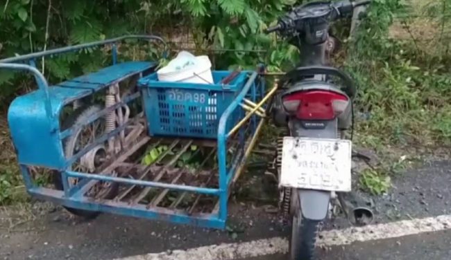 ลุงขับขี่รถจักรยานยนต์แบบพ่วงข้าง เฉี่ยวชนเสาไฟ ทำให้รถสะบัด ตกลงกระแทกพื้นถนนดับ