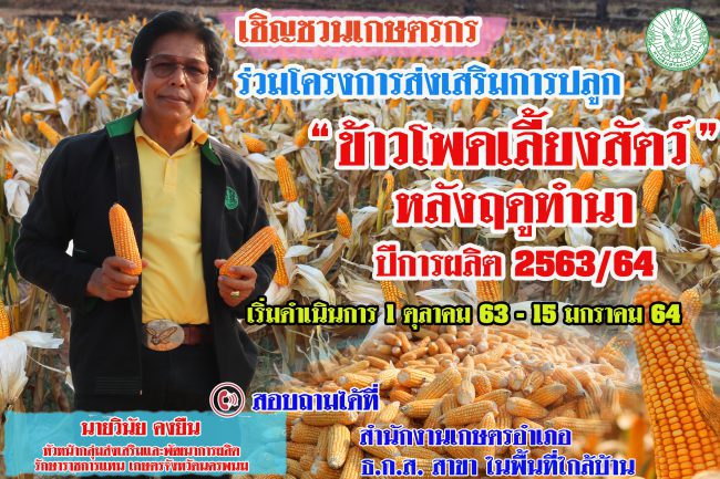 ข้าวโพดเลี้ยงสัตว์ เป็นพืชเศรษฐกิจที่สำคัญของประเทศไทย เนื่องจากเป็นวัตถุดิบที่สำคัญในอุตสาหกรรมอาหารสัตว์ ซึ่งเป็นอุตสาหกรรมที่มีมูลค่าการส่งออกประมาณ 80,000 ล้านบาทต่อปี และปัจจุบันพบว่าผลผลิตข้าวโพดเลี้ยงสัตว์ที่ผลิตภายในประเทศมีปริมาณไม่เพียงพอกับความต้องการของตลาด ซึ่งคาดว่าอุตสาหกรรมอาหารสัตว์มีความต้องการข้าวโพดเลี้ยงสัตว์ประมาณ 8 ล้านตัน ในขณะที่ปริมาณผลผลิตข้าวโพดเลี้ยงสัตว์ที่ผลิตได้ในประเทศมีเพียง 5 ล้านตัน ทำให้ต้องมีการนำเข้าข้าวสาลีเพื่อเป็นวัตถุดิบทดแทนข้าวโพดเลี้ยงสัตว์เป็นจำนวนมากในแต่ละปี เพื่อให้มีผลผลิตข้าวโพดเลี้ยงสัตว์ที่เพียงพอกับความต้องการ และกระจายผลผลิตข้าวโพดเลี้ยงสัตว์ออกสู่ตลาด จากสถานการณ์ปริมาณผลผลิตข้าวโพดเลี้ยงสัตว์ที่ผลิตได้ภายในประเทศยังไม่เพียงพอกับความต้องการของตลาด จึงได้มีการจัดทำ “โครงการส่งเสริมการปลูกข้าวโพดเลี้ยงสัตว์หลังฤดูทำนา ปีการผลิต 2563/64” เพื่อส่งเสริมให้เกษตรกรสามารถปลูกข้าวโพดเลี้ยงสัตว์ได้อย่างถูกต้องตามหลักวิชาการ มีผลผลิตที่คุ้มค่า สร้างรายได้ทดแทนการปลูกข้าวนาปรังในพื้นที่ที่ไม่เหมาะสม