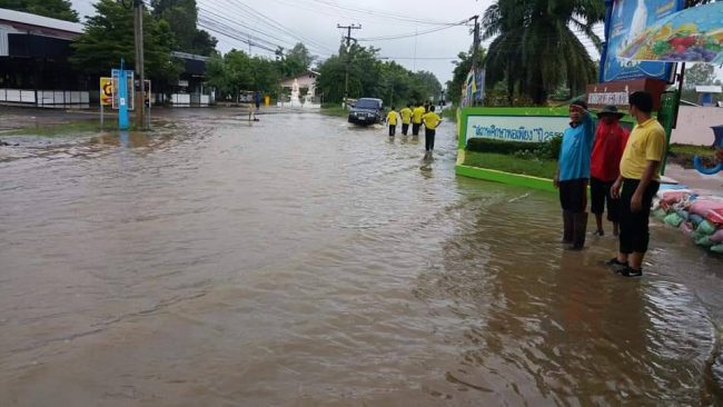 เมื่อเวลา 10.00 น. วันที่ 8 ต.ค. ที่ จ.ศรีสะเกษ ผู้สื่อข่าวรายงานว่า หลังจากมีพายุฝนตกหนักตลอดทั้งคืนที่ผ่านมา ส่งผลทำให้หลายพื้นที่ได้รับผลกระทบจากสถานการณ์น้ำท่วมขังระบายไม่ทันหลายจุด โดยเฉพาะบริเวณพื้นที่ตามแนวเทือกเขาพนมดงรัก ชายแดนไทย-กัมพูชา อ.ขุนหาญ มีน้ำท่วมขังบริเวณหน้าโรงเรียนบ้านสำโรงเกียรติ ต.บักดอง อ.ขุนหาญ ครูและนักเรียนได้ช่วยกันนำกระสอบทรายมาปิดกั้นบริเวณหน้าประตูรั้วโรงเรียนเพื่อไม่ให้น้ำไหลผ่านเข้าท่วมอาคารเรียน ส่วนที่อ่างเก็บน้ำหนองสิ อ.ขุนหาญ ขณะนี้น้ำได้เอ่อล้นสปรินเวย์แล้ว