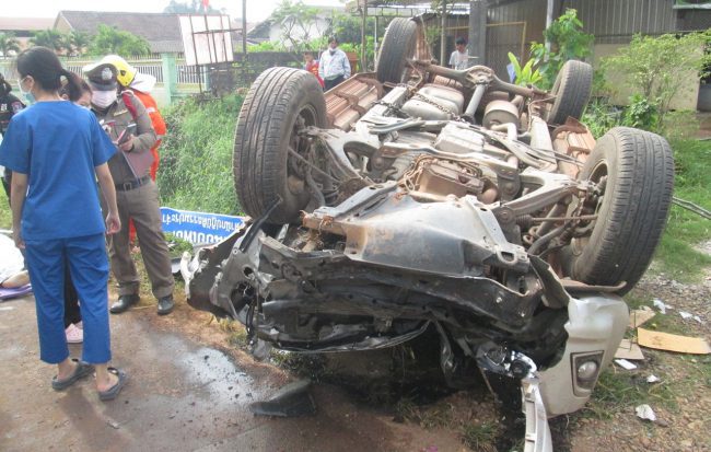 เวลา 08.10 น. วันที่ 7 พ.ย. ร.ต.อ.ชม ชูรัตน์ รองสารวัตร(สอบสวน) สภ.เมืองนครพนม รับแจ้งอุบัติเหตุรถยนต์พลิกคว่ำมีผู้เสียชีวิต เยื้องห้างโกลด์บรอนซ์เฮ้าส์ ถนนบายพาสสายนครพนม-ธาตุพนม จึงประสานแพทย์เวร รพ.นครพนม เจ้าหน้าที่กู้ภัยศรีสัตตนครพนม กู้ภัยลำโขงเฟรนด์ชิฟ รุดไปตรวจสอบ