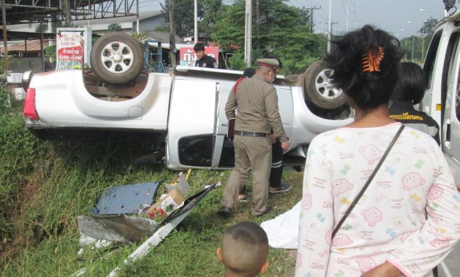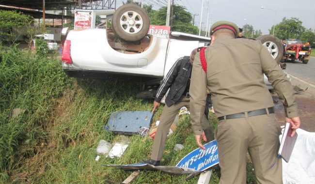 ที่เกิดเหตุเป็นถนน 4 เลน ฝั่งขาเข้าตัวเมืองหน้าร้านสถานีกุ้งสด พบรถยนต์กระบะยี่ห้ออีซูซุ สีบอรนซ์เงิน ทะเบียน 2 ฒจ 3116 กรุงเทพฯ สภาพพลิกคว่ำหงายท้องล้อชี้ฟ้า กระจังหน้ารถพังยับ น้ำมันเครื่องไหลนองพื้น เกยอยู่บนปากคลอง พบป้ายปักทางเข้าวัดน้อยโพธิ์คำโค่นได้รับความเสียหาย