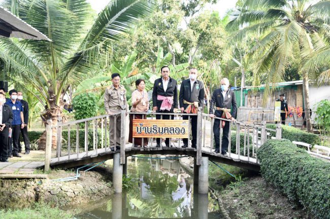 จากนั้น นายกรัฐมนตรีและคณะได้เดินทางไปเยี่ยมชมการดำเนินกิจกรรมของหมู่บ้านรางวัลพระราชทานหมู่บ้านเศรษฐกิจพอเพียง “อยู่เย็น เป็นสุข” บ้านคลองวัว ณ หมู่ที่ 5 หมู่บ้านคลองวัว ต.เหมืองใหม่ อ.อัมพวา โดยมีผู้ช่วยผู้ใหญ่บ้าน หมู่ที่ 5 กล่าวรายงานการจัดทำแผนชุมชน การพัฒนาหมู่บ้านคลองวัว และกิจกรรมของกลุ่มวิสาหกิจชุมชน เยี่ยมชมวิสาหกิจชุมชน การแปรรูปกล้วยหักมุก การทำน้ำมันมะพร้าวอโวคาโด และการทำมะพร้าวแปรรูปครบวงจร