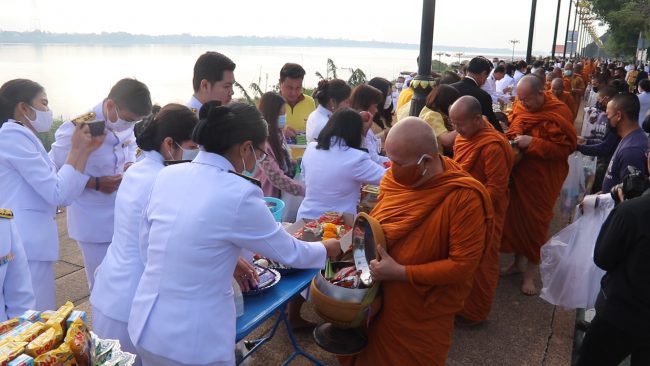 วันนี้ 5 ธันวาคม 2563 ที่บริเวณหน้าวัดมหาธาตุ ริมฝั่งแม่น้ำโขง อำเภอเมือง จังหวัดนครพนม นายไกรสร กองฉลาด ผู้ว่าราชการจังหวัดนครพนม พร้อมด้วยนายสุวิทย์ จันทร์หวร รองผู้ว่าราชการจังหวัดนครพนม นายธวัชชัย รอดงาม รองผู้ว่าราชการจังหวัดนครพนม นำข้าราชการ ตุลาการ ศาล ทหาร ตำรวจ สมาชิกเหล่ากาชาดจังหวัดนครพนม ตลอดจนนักเรียน นักศึกษา พ่อค้า และประชาชนจังหวัดนครพนม ร่วมกันประกอบพิธีบำเพ็ญกุศล ทำบุญตักบาตรพระสงฆ์และสามเณร 89 รูป ถวายเป็นพระราชกุศลแด่ พระบาทสมเด็จพระบรมชนกาธิเบศร มหาภูมิพลอดุลยเดชมหาราช บรมนาถบพิตร เนื่องในโอกาสวันคล้ายวันพระบรมราชสมภพ วันชาติ และวันพ่อแห่งชาติ 5 ธันวาคม 2563 โดยต่างได้พร้อมใจกันนำข้าวสารอาหารแห้ง น้ำดื่ม ตลอดจนเครื่องจตุปัจจัยต่าง ๆ เดินทางมารอตักบาตร ตั้งแต่เวลา 07.00 น. ด้วยน้อมสำนึกในพระมหากรุณาธิคุณ หาที่สุดมิได้ของพระองค์ ที่ทรงมีต่อพสกนิกรชาวไทย ทรงมีโครงการในพระราชดำริ พระราชดำรัสอย่างมากมาย เพื่อเป็นต้นแบบให้พสกนิกรทุกคนได้น้อมนำไปประพฤติปฏิบัติใช้ในชีวิตประจำ
