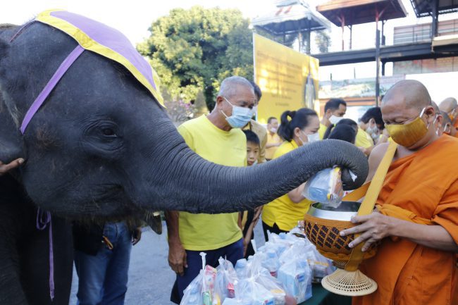 ช้างแสนรู้ 9 เชือก ร่วมทำบุญตักบาตร ถวายเป็นพระราชกุศลในหลวง ร. 9