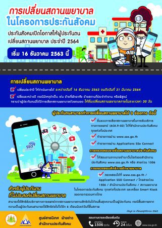 นายทศพล กฤตวงศ์วิมาน เลขาธิการสำนักงานประกันสังคม กระทรวงแรงงาน แจ้งว่า สำนักงานประกันสังคมได้เปิดให้ผู้ประกันตนสามารถแจ้งขอเปลี่ยนแปลงสถานพยาบาลประจำปี 2564 หรือสนใจจะเปลี่ยนสถานพยาบาลระหว่างปี ด้วยเหตุจำเป็นไม่ได้รับความสะดวก ในการไปรับบริการทางการแพทย์ ณ สถานพยาบาลที่เลือกไว้ก่อนหน้านี้ เช่น ย้ายที่พักอาศัย ย้ายสถานที่ประจำทำงาน หากผู้ประกันตนมีความประสงค์จะเปลี่ยนสถานพยาบาลสามารถยื่นแบบเลือกสถานพยาบาลในการรับบริการทางการแพทย์ สปส. 9-02 ได้ที่สำนักงานประกันสังคมกรุงเทพมหานครพื้นที่/จังหวัด/สาขาทุกแห่งทั่วประเทศ หรือทำรายการผ่านเว็บไซด์ www.sso.go.th และทำรายการผ่าน Applications SSO Connect ได้ตั้งแต่ 16 ธันวาคม 2563 จนถึงวันที่ 31 มีนาคม 2564