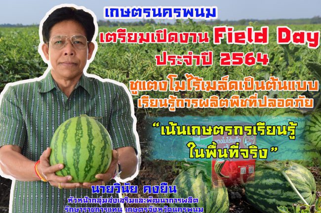 สำนักงานเกษตรจังหวัดนครพนม เตรียมเปิดงานวันถ่ายทอดเทคโนโลยีเพื่อเริ่มต้นฤดูกาลผลิตใหม่ (Field Day) ประจำปี 2564 พร้อมชู !! แตงโมไร้เมล็ดเป็นต้นแบบเรียนรู้การผลิตพืชที่ปลอดภัย “เน้นเกษตรกรเรียนรู้จริงในพื้นที่” โดยกำหนดจัดงานในวันที่ 6 มกราคม 2564 ณ ศูนย์เรียนรู้การเพิ่มประสิทธิภาพการผลิตสินค้าเกษตร (ศพก.) เครือข่าย อำเภอท่าอุเทน บ้านท่าจำปา หมู่ 2 ตำบลท่าจำปา อำเภอท่าอุเทน จังหวัดนครพนม เพื่อถ่ายทอดองค์ความรู้และบริการองค์ความรู้ทางการเกษตรในรูปแบบสถานีการเรียนรู้ เช่น การลดต้นทุนการผลิต เพิ่มผลผลิต โดยใช้เทคโนโลยีและนวัตกรรม การแปรรูป เพื่อมูลค่าและการตลาดแบบออนไลน์”