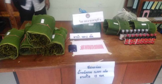 เวลาประมาณ 12.30 น. ได้ร่วมกันตรวจยึด ยาเสพติด ยาบ้า ลักษณะเม็ด สีส้ม จำนวน 168 เม็ด ยาบ้า ลักษณะเม็ด สีเขียว จำนวน 2 เม็ด รวมยาบ้าทั้งหมดจำนวน 170 เม็ด ใบกระท่อมสด จำนวน 2 มัดน้ำหนักรวมประมาณ 1,270 กรัมเเละบรรจุอยู่ในถุงพลาสติกใส จำนวน 1ใบ น้ำหนักรวมประมาณ 662 กรัม ใบกระท่อมสด จำนวน 4 มัดน้ำหนักรวมประมาณ 2,824 กรัม ใบกระท่อมสด บรรจุอยู่ในถุงพลาสติกสีฟ้าจำนวน 1ใบน้ำหนักรวมประมาณ 833กรัม รวมใบกระท่อมสดทั้งหมด 5,589 กรัม และยาแก้ใอชนิดน้ำเชื่อมยี่ห้อไดเพ็นนิลที่ยังไม่ได้ใช้ จำนวน 7 ขวด เเละยาน้ำแก้ไอชนิดน้ำเชื่อมยี่ห้อ ดาทิสซินที่ยังไม่ได้ใช้ จำนวน 8 ขวด สถานที่ตรวจยึดบริเวณบ้านของนายธรรมนูญ สมทอง บ้านเลขที่ 300 ม.3 บ.บักดอง ต.บักดอง อ.ขุนหาญ จ.ศรีสะเกษ เจ้าหน้าที่ตำรวจจึงได้ตรวจยึดของกลางทั้งหมดส่งพนักงานสอบสวน สภ.ขุนหาญ เพื่อดำเนินคดีตามกฎหมายต่อไป