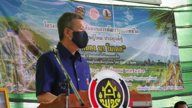 นายธงชัย เจริญพานิชย์กุล รองผู้ว่าราชการจังหวัดตรีสะเกษ กล่าวว่า กรมการพัฒนาชุมชน ได้จัดสรรงบประมาณแผนงานพื้นฟูเศรษฐกิจและสังคมที่ได้รับผลกระทบจกการะบาดของโรคติดเชื้อไวรัสโคโรนา 2019 ให้สำนักงานพัฒนาชุมชนจังหวัดศรีสะเกษดำเนินโครงการพัฒนาพื้นที่ต้นแบบการพัฒนาคุณภาพชีวิตตามหลักทฤษฎีใหม่ประยุกต์สู่ “โดก หนอง นา โมเดล” ในระหว่างเดือนธันวาคม 2563 ถึงมีนาคม 2564 ซึ่งจังหวัดศรีสะเกษมีกลุ่มเป้าหมายจำนวน 1,434 คน ประกอบด้วย ครัวเรือนพื้นที่ต้นแบบการพัฒนาคุณภาพชีวิต จำนวน 1,050 คน และผู้เข้าร่วมโครงการจ้างงานสร้างรายได้ จำนวน 384 คน แบ่งการอบรมออกเป็น ๑๔ รุ่นๆ ละ ๕ วัน เพื่อส่งเสริมกระบวนการเรียนรู้ และการมีส่วนร่วมของประชาชน ส่งเสริมและพัฒนาเศรษฐกิจฐานรากให้มีความมั่นคงและเสถียรภาพ ภายใต้หลักปรัชญาของเศรษฐกิจพอเพียงของพระบาทสมเด็จพระบรมชนกาธิเบศร มหาภูมิพลอดุลยเดชมหาราช บรมนาถบพิตร และพระบาทสมเด็จพระปรเมนทรรามาธิบดีศรีสินทรมหาวชิราลงกรณ พระวชิรเกล้าเจ้าอยู่หัว มีพระปฐมบรมราชโองการพระราชทานแก่ประชาชนชาวไทยความว่า “เราจะสีบสาน รักษาและต่อยอด และครองแผ่นดินโดยธรรม เพื่อประโยชน์สุขแห่งอาณาราษฎรตลอดไป” ตลอดจนสนับสนุนให้มีการจัดทำและใช้ประโยชน์จากข้อมูลสารสนเทศศึกษา วิเคราะห์ วิจัยจัดทำยุทธศาสตร์ชุมชน ฝึกอบรมและพัฒนาบุคลากรที่เกี่ยวข้องในการพัฒนาชุมชน เพื่อให้เป็นชุมชนเข้มแข็งอย่างยั่งยืน ภายใต้วิสัยทัศน์ “เศรษฐกิจฐานรากมั่นคงและชุมชนพึ่งตนเองได้ภายในปี ๒๕๖๕”นี้