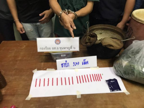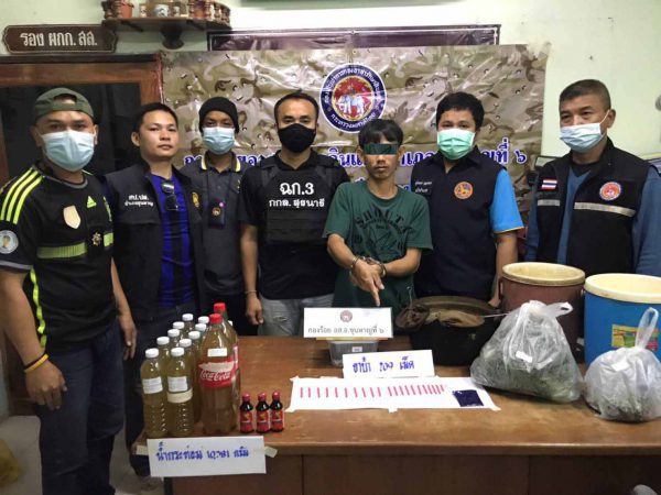เวลาประมาณ 16.50 น.ร่วมกันจับกุมนายอาทิยะ ไชยทอง อายุ 33 ปี บ้านเลขที่ 135 ม.6 ต.บักดอง อ.ขุนหาญ จ.ศรีสะเกษ พร้อมด้วยของกลาง เป็นน้ำต้มใบพืชกระท่อม(ยังไม่กรอง) น้ำหนัก 6,625กรัม น้ำต้มใบพืชกระท่อม(กรองแล้ว) น้ำหนัก 3,765 กรัม