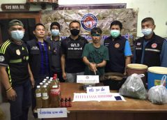 เวลาประมาณ 16.50 น.ร่วมกันจับกุมนายอาทิยะ ไชยทอง อายุ 33 ปี บ้านเลขที่ 135 ม.6 ต.บักดอง อ.ขุนหาญ จ.ศรีสะเกษ พร้อมด้วยของกลาง เป็นน้ำต้มใบพืชกระท่อม(ยังไม่กรอง) น้ำหนัก 6,625กรัม น้ำต้มใบพืชกระท่อม(กรองแล้ว) น้ำหนัก 3,765 กรัม
