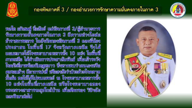 ในการนี้ พลโท อภิเชษฐ์ ซื่อสัตย์ แม่ทัพภาคที่ 3/ผู้บัญชาการศูนย์บรรเทาสาธารณภัย กองทัพภาคที่ 3 มีความห่วงใยต่อข้าราชการทหาร ในสังกัดกองทัพภาคที่ 3 และพี่น้องประชาชน ในพื้นที่ 17 จังหวัดภาคเหนือ จึงได้มอบหมายให้โรงพยาบาลทหารทั้ง 10 แห่ง ในพื้นที่ภาคเหนือ ได้ดำเนินการประชาสัมพันธ์ เพื่อเฝ้าระวังโรคภัยที่มาพร้อมกับฤดูหนาว ซึ่งหากพบว่าตนเองหรือคนรอบข้าง มีอาการบ่งชี้ หรือสงสัยว่าป่วยด้วยโรคตามขั้นต้น ขอให้ได้ไปพบแพทย์ ณ โรงพยาบาลทหารทั้ง 10 แห่งในพื้นที่ภาคเหนือ หรือโรงพยาบาลของกระทรวงสาธารณสุขใกล้บ้าน เพื่อคัดกรอง วินิจฉัย และรักษาต่อไป