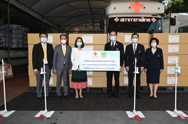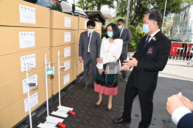 นายกฤษฎา บุญราช ผู้อำนวยการสำนักงานบริหารกิจการเหล่ากาชาด สภากาชาดไทย รับมอบแท่นกดเจลแอลกอฮอล์แบบเท้าเหยียบ 200 แท่น จากนางสาวรุจนาฏก์ วิมลสถิตย์ รองกรรมการผู้จัดการใหญ่อาวุโส ด้านบรรษัทสัมพันธ์ เครือเจริญโภคภัณฑ์ และคณะจากบริษัท เครือเจริญโภคภัณฑ์ จำกัด เพื่อมอบให้เหล่ากาชาดจังหวัด นำส่งให้แก่โรงพยาบาลทั่วประเทศไปใช้บริการประชาชนที่มาตรวจรักษาตามโรงพยาบาลหรือสถานพยาบาลของรัฐในต่างจังหวัดโดยมีผู้เข้าร่วมรับมอบ ประกอบด้วย  นายแพทย์พิชิต ศิริวรรณ รองผู้อำนวยการสำนักงานบรรเทาทุกข์และประชานามัยพิทักษ์ สภากาชาดไทย นางสุกานดา วรเชษฐบัญชา ที่ปรึกษาสำนักงานบริหารกิจการเหล่ากาชาด สภากาชาดไทย และคณะ ณ บริเวณหน้าอาคารเทิดพระเกียรติสมเด็จพระญาณสังวร (เจริญ สุวฑฺฒโน) สภากาชาดไทย