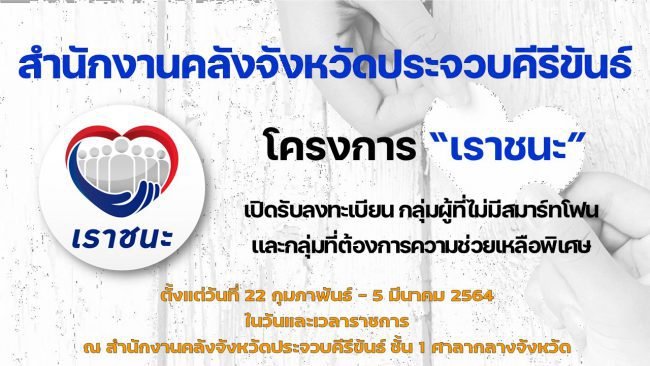 วันที่ 22 กุมภาพันธ์ 64 นางสาวเกศริน ภัทรเปรมเจริญ คลังจังหวัดประจวบคีรีขันธ์ เปิดเผยว่า หลังจากรัฐบาลกำหนดเปิดบริการลงทะเบียนโครงการเราชนะให้กับประชาชนกลุ่มพิเศษ ไม่มีโทรศัพท์สมาร์ทโฟน ให้ไปแสดงตนและนำบัตรประชาชนไปแสดงที่ธนาคารกรุงไทย ธนาคารออมสิน ธนาคาร ธกส. ทุกสาขา โดยขยายเวลาถึงวันที่ 5 มีนาคม 2564 ตั้งแต่เวลา 08.30-16.30 น.ล่าสุดเพื่ออำนวยความสะดวกลดความแออัด สำนักงานคลังจังหวัดได้เปิดบริการที่ศาลากลางจังหวัดประจวบฯ ชั้น 1 สรรพากรพื้นที่จังหวัดเปิดบริการที่สำนักงานสรรพากรอำเภอเมืองฯ ถนนสุขใจ และที่สำนักงานสรรพสามิตพื้นที่ ถนนมหาราช 2 เขตเทศบาลเมือง นอกจากนั้นได้จัดหน่วยเคลื่อนที่ออกบริการประชาชนกลุ่มพิเศษ ผู้สูงอายุ ผู้ป่วยติดเตียง โดยเจ้าหน้าที่ไปบริการลงทะเบียนที่บ้านพัก ขณะเดียวกันร้านค้าและผู้ประกอบการในจังหวัดประจวบฯ สมัครเข้าร่วมโครงการเราชนะแล้วมากกว่า 10,000 แห่ง