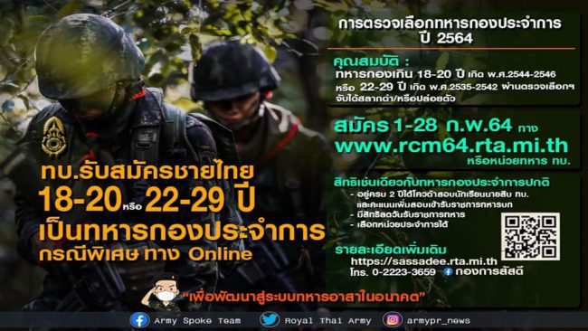ตามที่ พลเอก ณรงค์พันธ์ จิตต์แก้วแท้ ผู้บัญชาการทหารบก มีนโยบายให้กองทัพบกริเริ่ม “การรับสมัครทหารกองเกินเป็นทหารกองประจำการโดยวิธีร้องขอ (กรณีพิเศษ) ด้วยระบบออนไลน์” ในการตรวจเลือกทหารกองเกินเข้ารับราชการทหารกองประจำการ ประจำปี 2564 เพื่อเดินหน้าพัฒนาการตรวจเลือกทหารกองประจำการ มุ่งสู่ระบบทหารกองประจำการอาสา ทดแทนการเรียกเกณฑ์ให้เป็นรูปธรรมในอนาคต ซึ่งเป็นไปตามนโยบายของกระทรวงกลาโหม ด้านการปฏิรูปของกองทัพและเพิ่มความหลากหลาย รวมถึงสร้างแรงจูงใจให้ชายไทยสมัครเป็นทหาร นั้น
