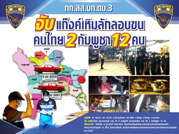 จนกระทั่งต่อมา เจ้าหน้าที่ได้พบรถยนต์นั่งส่วนบุคคลคันดังกล่าว มีนายสุบรรณฯ (ขอสงวนนามสกุล) เป็นผู้ขับขี่ และพบรถยนต์กระบะบรรทุกส่วนบุคคลคันดังกล่าว มีนายธรรมรัตน์ฯ (ขอสงวนนามสกุล) เป็นผู้ขับขี่ จึงเข้าไปตรวจค้นจากการตรวจสอบพบบุคคลต่างด้าวสัญชาติกัมพูชา รวม 10 คน นั่งอยู่บนรถยนต์กระบะคันดังกล่าว จากการซักถามแรงงานต่างด้าวเบื้องต้นยอมรับว่าจะเดินทางออกจากราชอาณาจักร โดยเดินทางมาจากกรุงเทพฯ มุ่งหน้า จ.สระแก้ว เพื่อกลับประเทศกัมพูชา ซึ่งทุกคนมีเอกสารหนังสือเดินทาง ส่วนนายสุบรรณฯ และนายธรรมรัตน์ฯ รับว่ารับงานมาจาก นายหนุ่ม ไม่ทราบชื่อและนามสกุลจริง ซึ่งปกติจะมีผู้ประสานงานฝ่ายกัมพูชา ที่เกี่ยวข้องในการดำเนินการขนย้าย ลำเลียง แรงงานคนต่างด้าวสัญชาติกัมพูชา ทั้งสิ้น