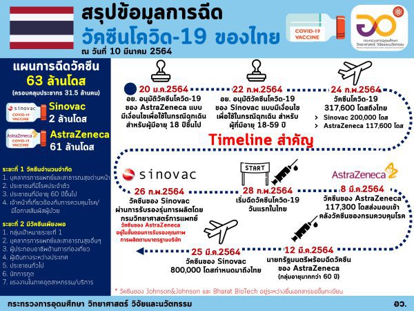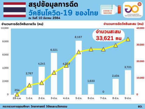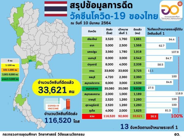 วันที่ 10 มีนาคม 2564 : ศาสตราจารย์ ดร.นายแพทย์ สิริฤกษ์ ทรงศิวิไล ปลัดกระทรวงการอุดมศึกษา วิทยาศาสตร์ วิจัยและนวัตกรรม (อว.) รายงานว่า กระทรวง (อว.) ได้ร่วมกับกระทรวงสาธารณสุข (สธ.) ติดตามและประมวลผลการฉีดวัคซีนโควิด-19 คนไทยในเชิงรุก โดยสรุปว่า “ขณะนี้ประเทศไทยได้ฉีดวัคซีนโควิด-19 แล้ว จำนวน 33,621 คน ใน 13 จังหวัด ทั้งหมดเป็นวัคซีนของซิโนแวค ผู้ได้รับวัคซีนในระยะแรกนี้ส่วนใหญ่ (76.9%) เป็นบุคลากรการแพทย์/สาธารณสุข/อสม. โดยจังหวัดสมุทรสาคร ฉีดวัคซีนแล้วจำนวนมากที่สุด ตามด้วยกรุงเทพมหานคร สมุทรปราการ นนทบุรี ชลบุรี ทั้งนี้ผู้ที่ได้รับวัคซีนมากกว่า 91% ไม่มีผลข้างเคียง โดยพบผลข้างเคียงใน 8.88% ของผู้ได้รับวัคซีน แต่อาการไม่รุนแรง”