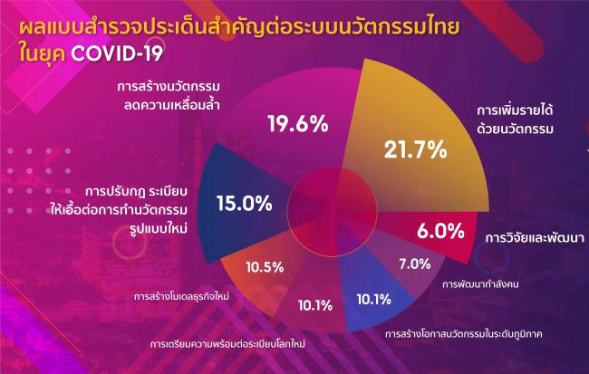· การปรับกฎระเบียบให้เอื้อต่อการทำนวัตกรรมรูปแบบใหม่ ๆ (15%) ในช่วงที่เกิดการระบาดของโรคโควิด -19 เป็นตัวเร่งให้เกิดทั้งธุรกิจนวัตกรรม สตาร์ทอัพ รวมทั้งความสนใจในด้านการพัฒนางานวิจัย – นวัตกรรมอย่างเต็มรูปแบบ แต่ในการเกิดขึ้นของสิ่งเหล่านี้กลับมีตัวแปรสำคัญคือเรื่องของกฎระเบียบที่ยังไม่สามารถอำนวยความสะดวกได้เท่าที่ควร ไม่ว่าจะเป็นกฎหมาย การลดข้อจำกัด โครงสร้างพื้นฐานที่ช่วยปูทางให้ความก้าวหน้าทางนวัตกรรมสามารถดำเนินไปได้อย่างเต็มที่ ทั้งนี้ ถ้าหากสิ่งเหล่านี้ถูกปลดล็อกได้มากขึ้นในอนาคตจะทำให้เห็นคนในกลุ่มต่าง ๆ โดยเฉพาะคนรุ่นใหม่และเยาวชนเข้ามามีบทบาทในภาคเศรษฐกิจฐานนวัตกรรมเพิ่มมากขึ้น รวมทั้งทำให้เกิดการลงทุนในด้านวิจัย พัฒนา และเทคโนโลยีที่สามารถสร้างคุณค่าและมูลค่าได้อย่างมีนัยสำคัญ